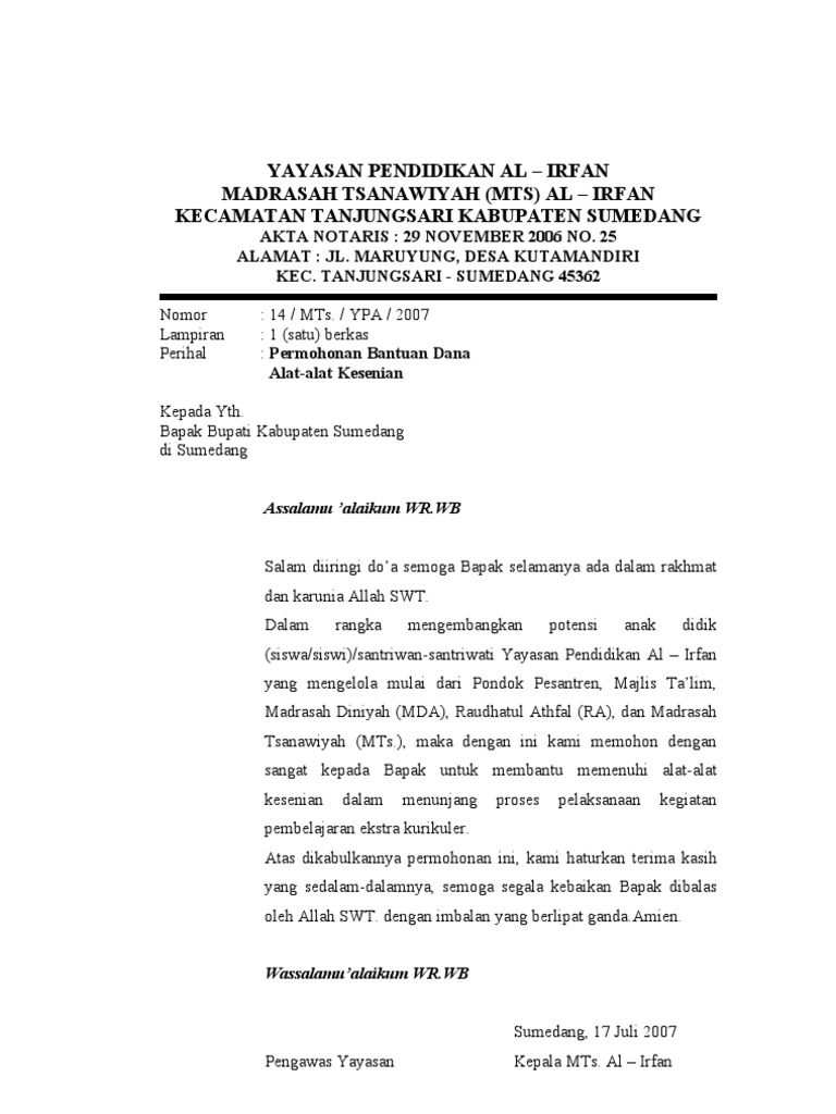 1 satu berkas Yang Terhormat. Dalam rangka untuk memenuhi standar sarana dan prasarana pendidikan di Smp Negeri 1 Pameungpeuk kabupaten Garut kami mohon bantuan untuk Alat -alat Kesenian sebesar Rp 102950000 Seratus dua Juta Sembilan ratus Lima puluh ribu Rupiah Sebagai bahan pertimbangan kami lampirkan. Find out the most recent pictures of Contoh Surat Permohonan Bantuan Alat Kesenian here and also you can receive the picture here simply.