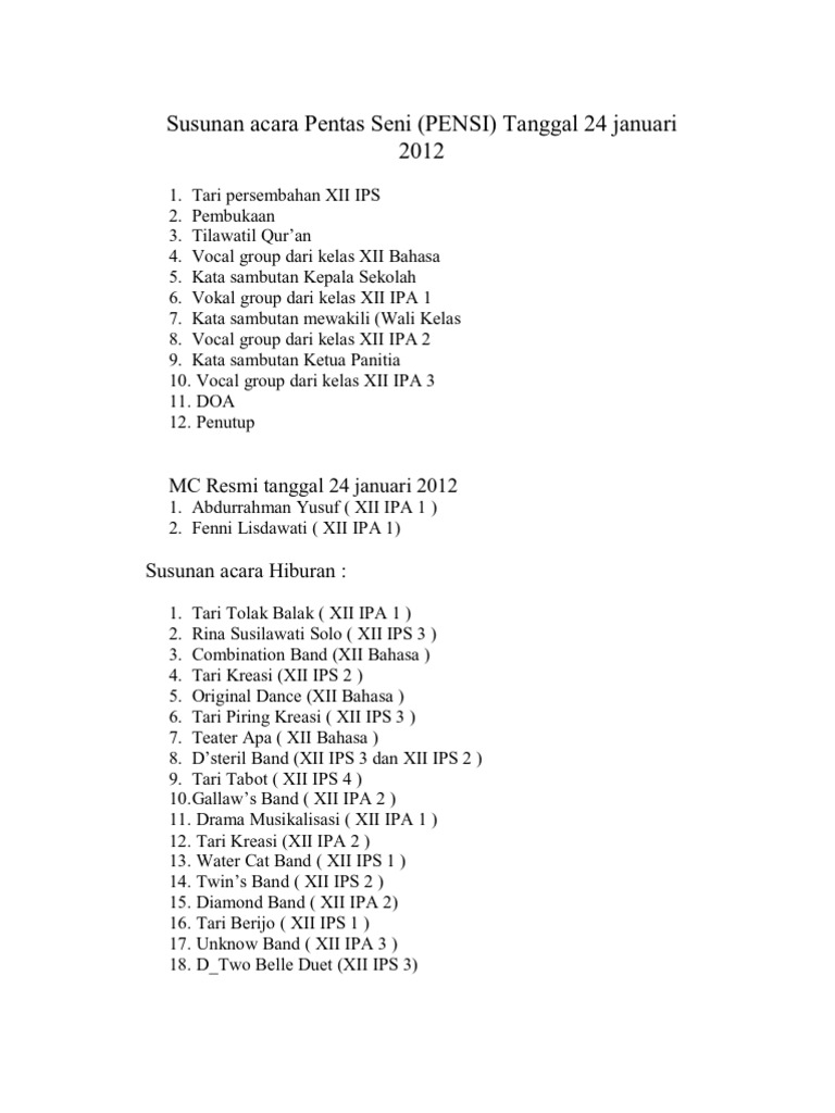 Talent Tari modern atau daerah kelas XII IPA dan IPS. Susunan Acara Pentas Seni PENSI PIDATO CALON KANDIDAT KETUA OSIS. Contoh proposal kegiatan sekolah pentas seni.